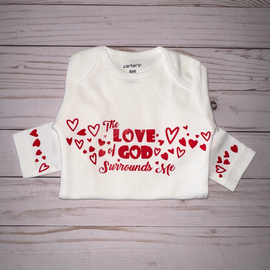 Super soft cotton material. Long sleeves.ย White color with red imprint. Size 6 months.ย Carters brand.