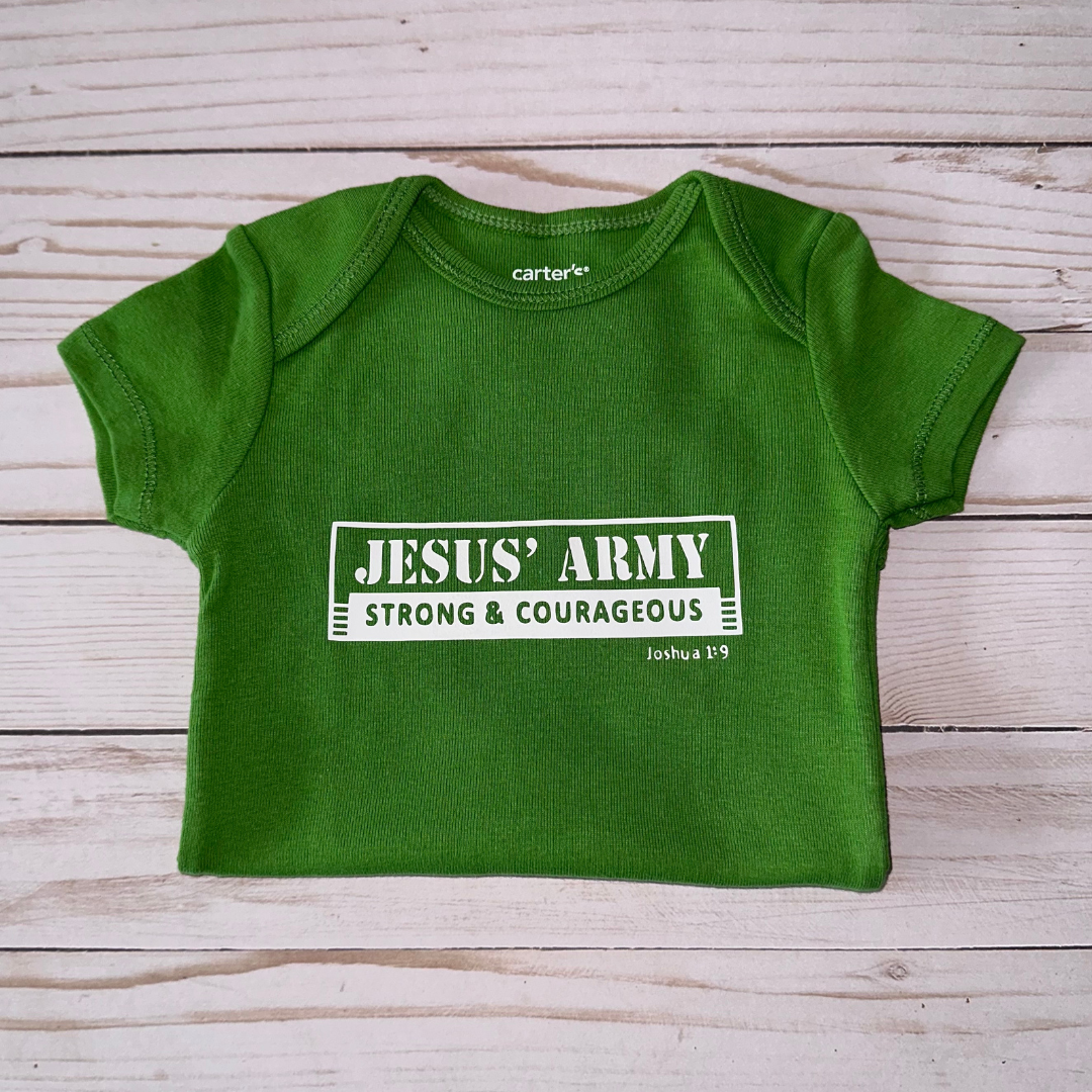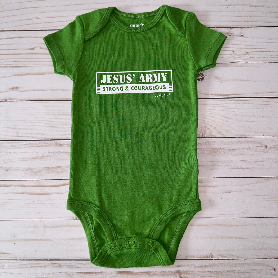 Super soft cotton material.ย Short sleeves.ย Olive color with white imprint. Size 6months. Carters Brand.